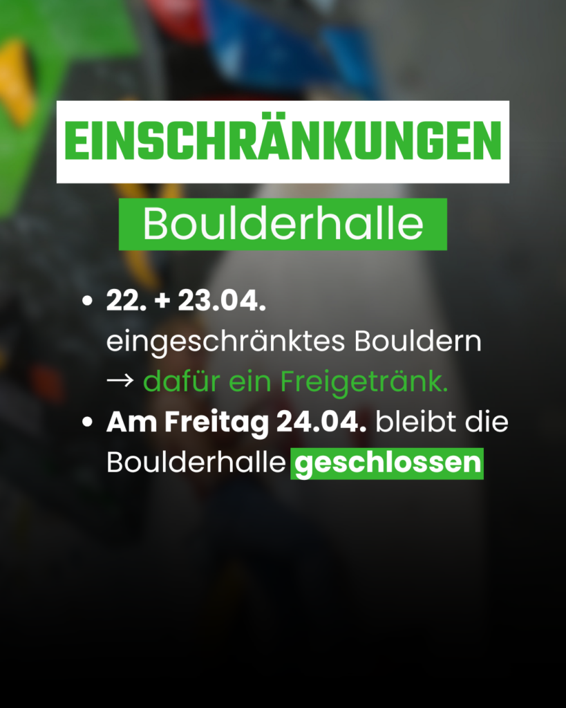 Die Boulderhalle ist am 22. + 23.04. eingeschränkt nutzbar – dafür gibt’s zur Entschädigung ein Freigetränk 🥤 Am Freitag, 24.04. bleibt sie komplett geschlossen.