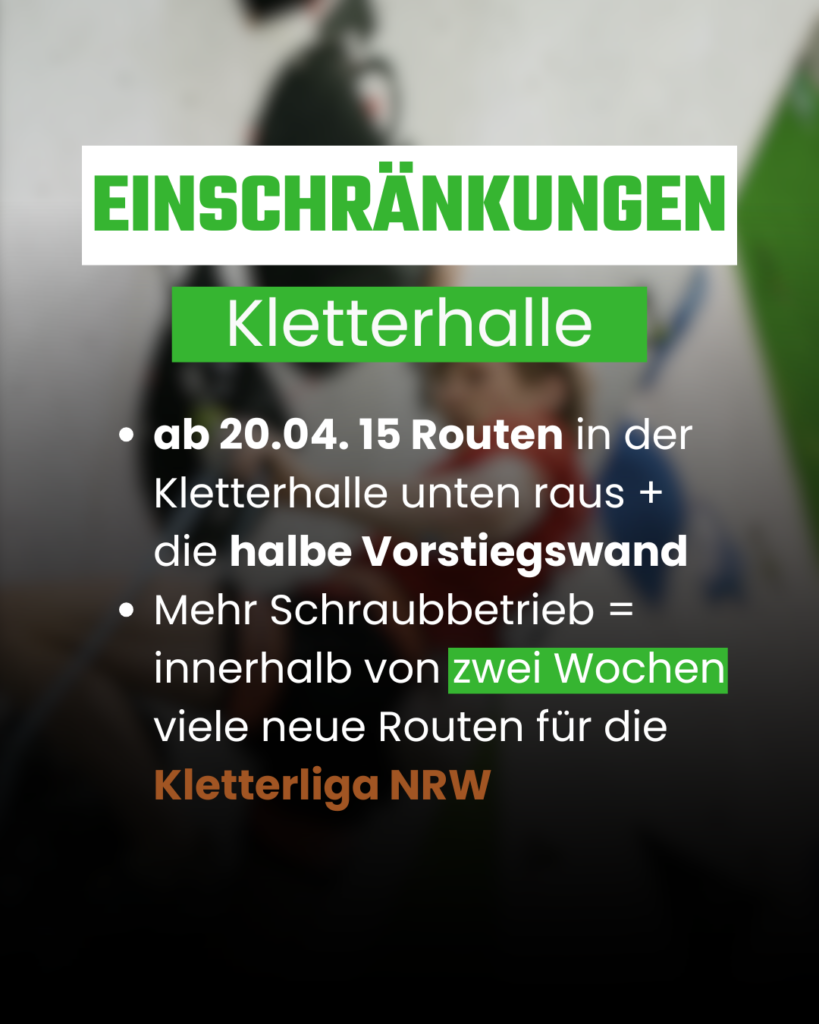 In der Kletterhalle fallen ab heute 15 Routen unten raus + die halbe Vorstiegswand. Der Grund: Mehr Schraubbetrieb – innerhalb von zwei Wochen kommen viele neue Routen für die Kletterliga NRW, die natürlich JEDER klettern kann  🧗