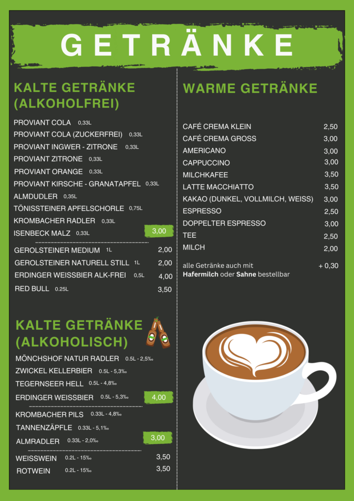 Bei uns bekommt ihr richtig guten Kaffee von der Rösterei Kaffeekultur aus Lüdenscheid, leckere Limos von Proviant, Almdudler und eine besondere Auswahl an Bieren.