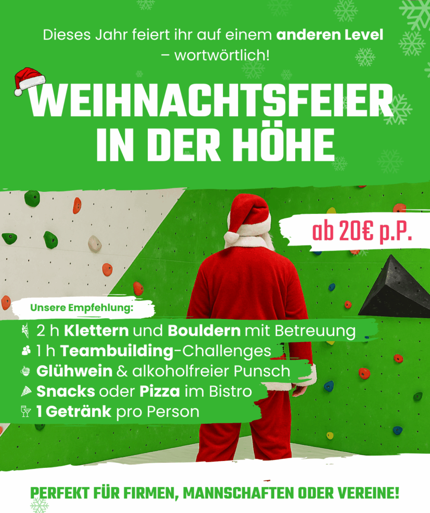 Ihr wollt dieses Jahr etwas Besonderes für eure Weihnachtsfeier? Bei uns in der Kletterwelt Sauerland könnt ihr euch ein Weihnachtsfeier-Paket ganz nach euren Wünschen schnüren. Ob Bouldern, Klettern, Teambuilding oder eine Kombination – ihr entscheidet, wie ihr feiert!